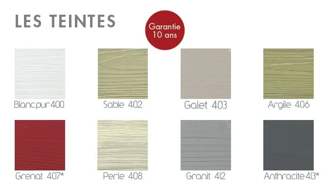 - COLORIS EN STOCK PERMANENT (Lame aboutée) : BLANC PUR 400 – SABLE 402 – GALET 403 – PERLE 408 – GRANIT 412 – ANTHRACITE 413