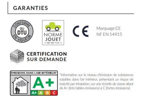 - Ecologique : le lambris fini est classé E1 (émission négligeable de formaldéhyde)