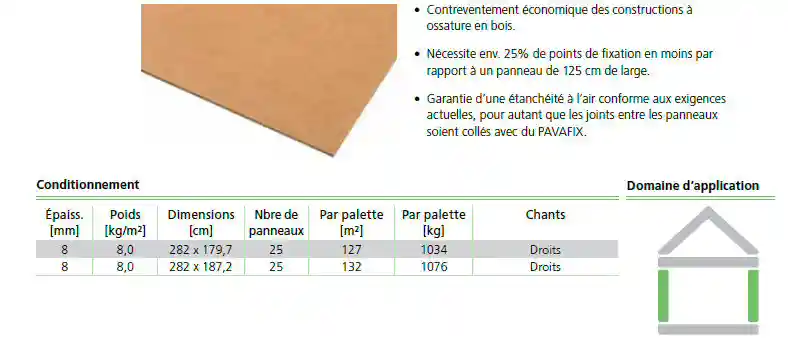 Il est conçu pour le contreventement des constructions à ossature bois. Comme il est ouvert à la diffusion, le panneau PAVAPLAN contribue à rendre la construction saine et respirante. Les panneaux PAVAPLAN se combinent parfaitement avec les autres produits PAVATEX comme par exeple, l’ISOLAIR, le PAVATHERM-PLUS ou le DIFFUTHERM.