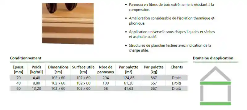Panneau isolant, réalisé en bois naturel, 100% écologique car exempt de matières nocives. Conçu pour la réalisation de planchers soumis à des pressions élevées :